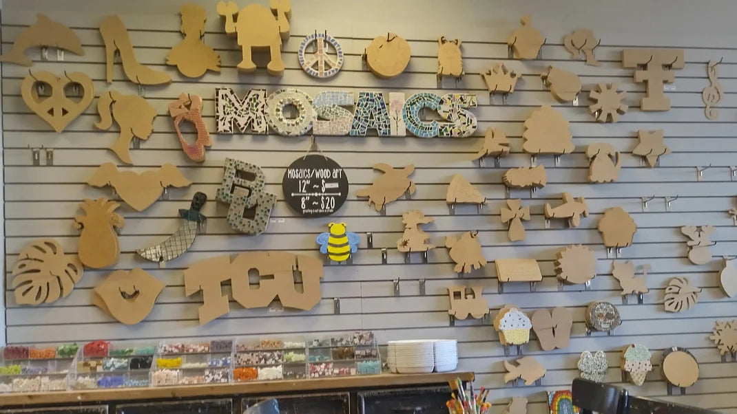 Come join in the fun and learn the art of mosaics! First-timers and long-time hobbyists have a blast with this simple puzzling art! We have dozens of wooden shapes to mosaics on, and you can mosaic onto many of our pottery pieces as well. Quiggly's offers a wide range of materials, grouts and adhesives to make your project look great!