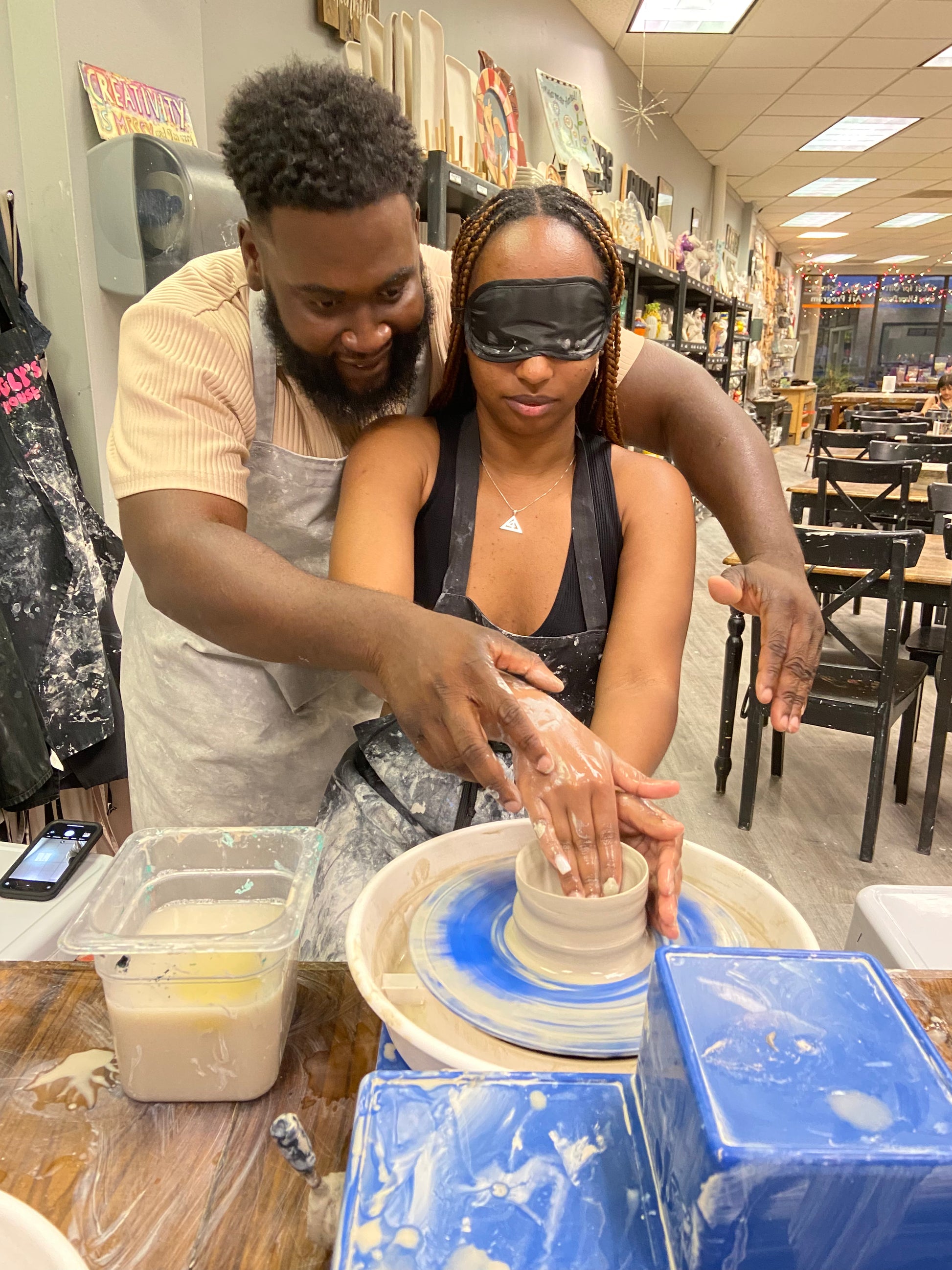 This is a great date night event! You and your partner will have your own wheel to start and will each make a project of your own. You will then take turns wearing a blindfold while your partner guides you through your next project!